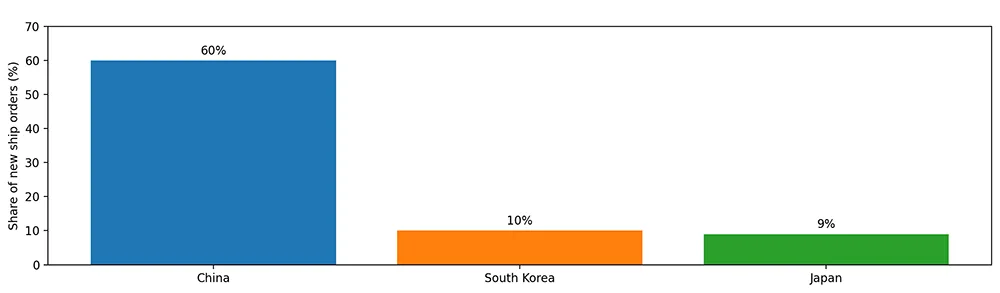 Recent industry reporting shows that global shipbuilding remains overwhelmingly concentrated in East Asia. In 2025, Chinese shipyards again led the market for new orders by a wide margin – capturing over 60% – while South Korea (10%) and Japan (9%) remained the other major players. This reinforces how few countries control the bulk of global shipbuilding capacity and orderbooks.