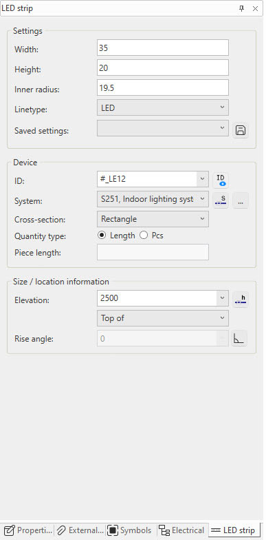 Our new LED strip tool is available in layout symbol functions. You can define the width, height, and other properties for the LED strips and draw them in 2D and 3D as any other Electrical symbols using different elevations. Drawing an LED strip creates a device with a device ID. The device ID enables LED strips to be used with product models, making them function like any other light fixtures.