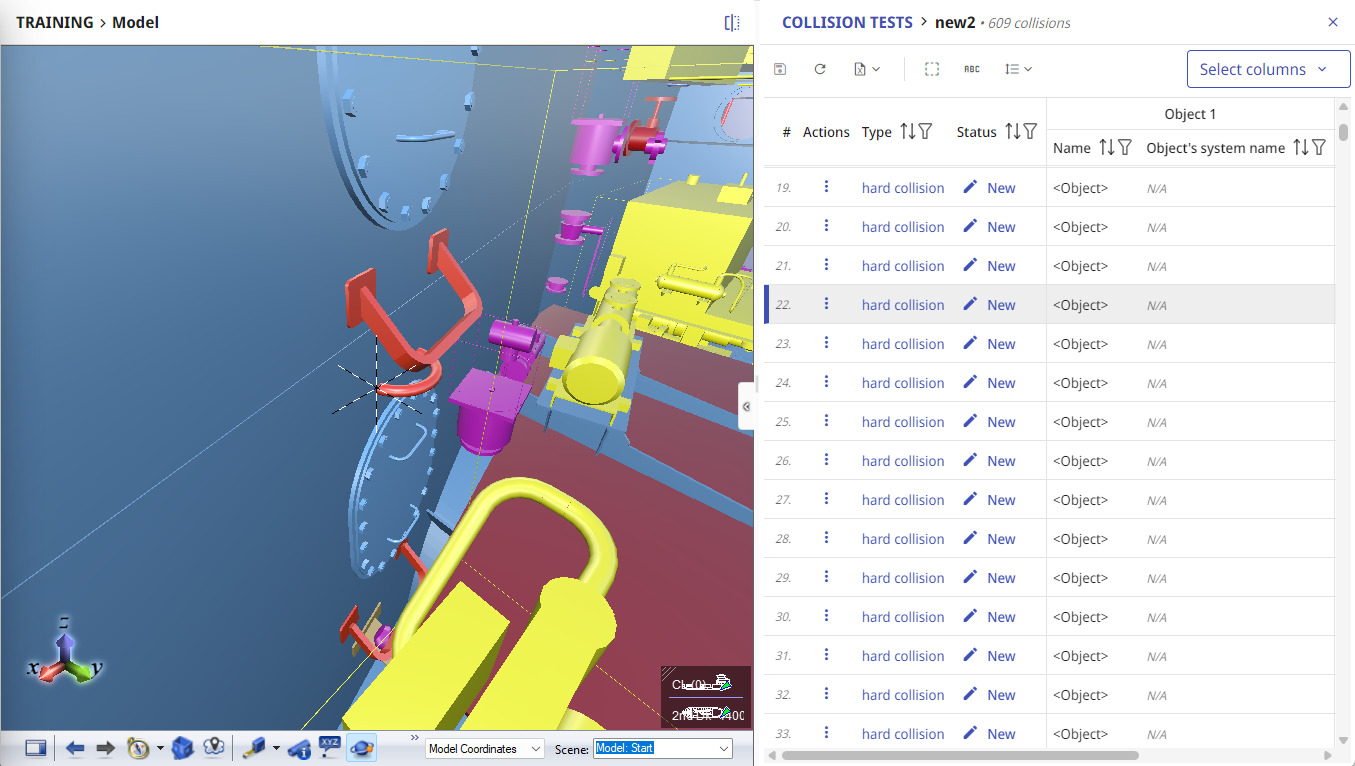 A saved collision test can be displayed any time in either eShare in a browser or eShare App, collision statuses can be changed accordingly, markups can be created for the effected objects, or you can rerun the collision test in eShare App. The collision test results can also be exported as an Excel file to enable further handling and utilization of the data.