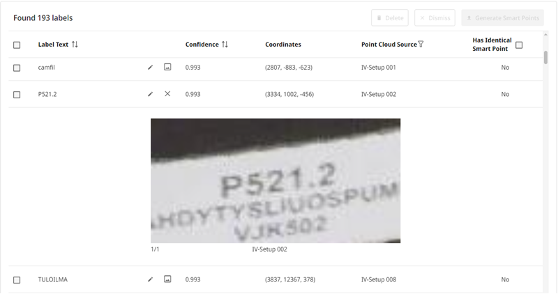 In the analysis view the found labels can be filtered according to newly found labels or labels found earlier, or labels already used to generate Smart Points. The actual results can then be filtered according to selected rules, which can utilize model keys, document object or Smart Point links, data in an Excel file, or regexes with patterns.