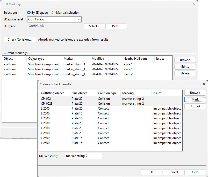Streamline installation with semi-automatic markings for outfitting objects on hull plate cutting data. Parts modeled in the Outfitting application that need to be welded to hull structures are now marked directly in the hull plate DXF contours.