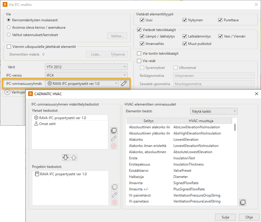 CADMATIC HVACilla tehdyistä IFC-malleista voi luoda tietosisällöltään vakioituja malleja valitsemalla IFC-viennissä IFC4-formaatin ja ohjelman asennuksen mukana tulevan RAVA IFC -propertysetit ver 1.0 ominaisuusryhmien määrittelytaulukon. Esimerkiksi linjasäätöventtiilillä on vakioidut tiedot: oikeat arvot oikeassa muuttujassa ja oikeassa yksikössä.